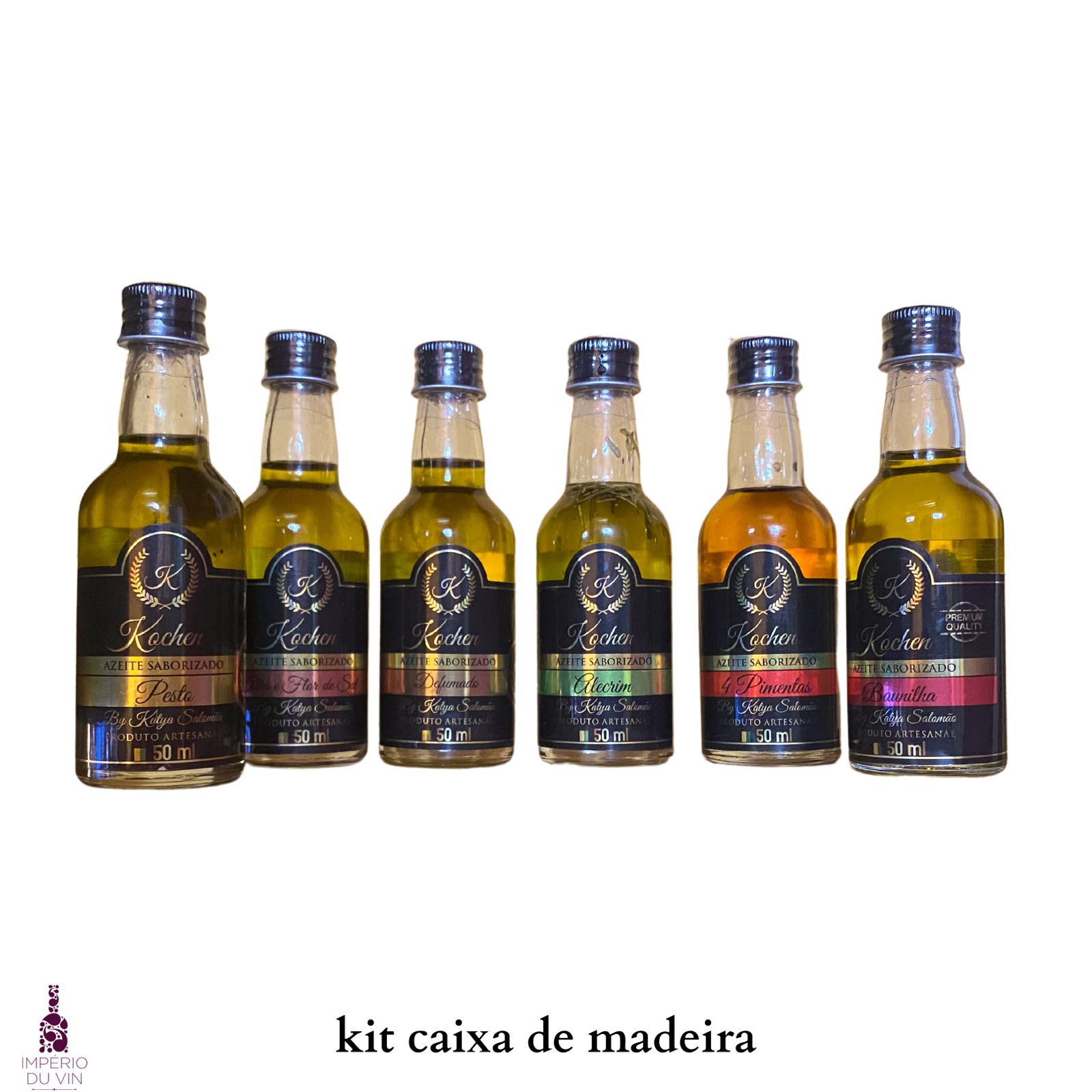 Kit em caixa de madeira mista com 6 mini azeites de 50ml cada.